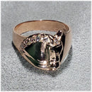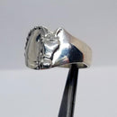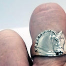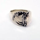 Cigar band type ring that tapers under the finger for great comfort. The horse has a double bridle and braided mane, similar to our Classic Dressage Horse Medallion design. One ear is tapered at an angle giving a very contemporary look. Multiple sizes and half sizes are available. Unique design and a favorite! Tempi does offer this ring as a cutomized design with STONES set where the braids would be. Typically we use White Sapphires, but you may choose another stone, Please EMAIL to start a dialogue.!! Photos included below. Sterling Silver
