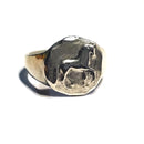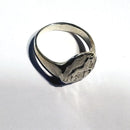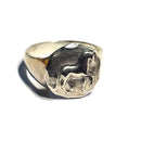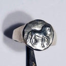 Our favorite small Piaffe Horse Round as a ring. This sweet design is the same size as the small round piaffe earring [ not the petite one] . The piaffe horse has a raised polished relief and a diamond cut satin finish surrounding him. The ring is 1/2 inch tall and the band tapers on the underside to a comfortable 3/16 inch wide. This ring is available in a wider variety of sizes and offered in sterling silver. Tempi can also make this in another metal, such as rose or yellow gold [ 10k or 14k ] by request. A quote would be sent and approved before we woud commence.
