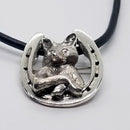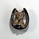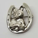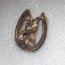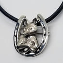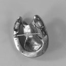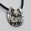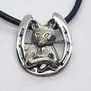 Our Snooty Fox in HorseShoe Slide / Brooch This larger horse shoe has a 3D fox with front paws crossed looking quite smug into the distance. The shoe has a groove and square nail holes and the fox has fur texture and perked ears as if listening for the hounds. Pin back AND 2 loops for hanging as a brooch. This design measures 1 inch tall x 1 inch wide and at least 1/2 inch deep. Available in Sterlign Silver or Rose Bronze. Does NOT come with a leather neck cord. A little whimsy and a favorite!!