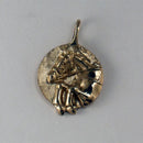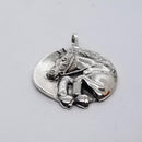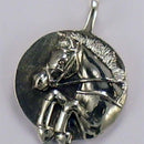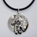 This is a medium version of our Cross Country Jumping Horse Medallion, measures 7/8 inch round. The horse has the same position, tack, and boots, reaching for the other side, as our large version. Overall height with the bail measures 1 1/4 inch. Arrives on a black leather neckcord. Choice of 16 inches or 18 inches. Always a favorite! Sterling Silver or our Rose Bronze.