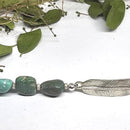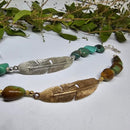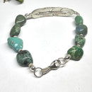 A feather means different things to many people.......and this one is sizeable for your wrist. Tempi's new textured feather has a lovely curve to fit your wrist comfortably, and a center polished stem. The feather "hairs " are a satin texture and the feather has open loops at each end for beads to complete the bracelet. All sterling silver findings and a lobster claw clasp give a secure closure for this beauty. Gem stones in nearly every color are available for this design: greens, blues, black, black and greys, purples, browns. Fits small, medium or large. If you are not sure what size to order, please leave your wrist measurement in the "Customer Notes" during check out and Tempi will reply. We will also send available beads in stock for your color choice to confirm. Shown here with natural turquoise nugget beads. Also available in Rose Bronze. A lovely comfortable bracelet. Any length available