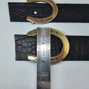 Another horse shoe buckle, but this one has been requested to be more weighty for the gentlman [ but still does quite well for you ladies ]. This buckle fits 1 1/5 inch wide belt. The buckle measures 2 1/4 inch tall x 2 1/2 inch wide. The shoe has a grove down the center of each side and 4 squared nail holes with a high polish. Available in White Bronze [ silvertone] or buttery Yellow Bronze [ yellowtone].