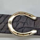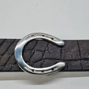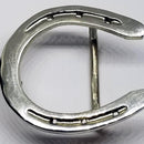 This buckle fits a 1 inch wide leather belt. The horse shoe resembles our other designs, with nail channels on each side and square nail holes. The buckle measures just 1 9/16 inches wide x 1 3/8 inches tall. Available in Silverton [ white jeweler's bronze] or yellwotone [yellow bronze]. Other sizes of horse shoe buckles are availble also. Tempi does carry leather belts, but not typically 1 inch width. A 1 inch width can be special ordered. Just send an email to inquire and start the process.
