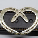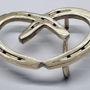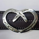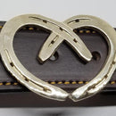 Our new large double Horse Shoe Buckle which forms a heart. Just in time for our special February date. The shoes have a deep groove channel with square nail holes and has a lovely weighty presence. This buckle measures 2 3/4 inches wide x 1 7/8 inches tall. This buckle fits a 1 1/2 inch wide belt. Shown in Yellow Bronze [ goldtone], Also available in White Bronze [silvertone].
