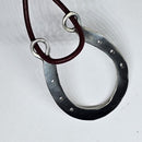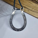 A lovely gift or Holiday Ornament, new for 2024! Our horse shoe holds your luck for your new year, new venture, new direction! This design has a recessed groove with square nail holes There is a high polish finish on front and back and room for engraving! 6 letters or numbers are included with the purchase. The shoe measures 1.5 inches tall x 1 3/8 inches at the widest point, 1 7/8 inches tall, and overall length is 5 inches. There is limited space for engraving, but could do some on front, some on back. Leave your engraving info in "Customer Notes" during check out. 6 letters/numbers are included with your purchase. 2 large circles sit at the heel of the shoe to easily hang the ornament. A 10 inch piece of 2 millimeter leather knotted is included to hang your lucky horse shoe! Colors vary [ green, red, blue, brown]. You may request a color, but availability will ultimately determine the color.