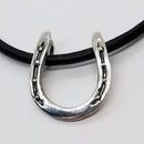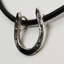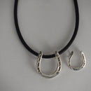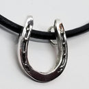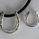 Horse Shoe Slide Large This horseshoe has been called " The Best HorseShoe" and it does not disappoint!. The horseshoe has 2 loops on the back and acts as a slide, fitting easily on our 3-millimeter black leather neck cord. The shoe measures 1 inch tall and 7/8 inch wide and has squared horseshoe nails showing in place. We also offer a medium-size version of this horseshoe design [ along with earring options] which is compared in some of the photo collections below for you. Sterling Silver