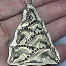 New for the 2023 season of a favorite graphic of mine converted into a Holiday Tree ornament. The raised relief of the six horses graduate with a wavy shape of a tree, with a "braided mane " effect allowing light to shine through. This design measures 1 7/8 inches wide at the bottom and 2 1/2 inches tall overall. arrives with a 10 inch knotted leather cord for hanging. A high polished back allows room for any engraving, 6 letters/ or numbers included. Leave any engraving info in "Customer Notes" during check out. Makes an exceptional gift or start your collection of hand crafted Equestrian Ornaments!! Exclusively from Tempi Design!!