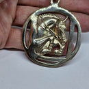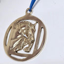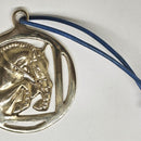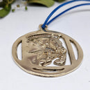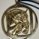 A favorite Jumper makes a super holiday gift ornamnet. This jumper horse has so much detail with a full bridle, martingale and boots with buckle straps! This horse fits inside a circle frame measureing 2 1/2 inches wide and comes witha 10 inch leather cord for hanging. The horse is nearly 3D with a raised relief and contours of his body in action. Available in silvertone or goldtone [ bronzes] ready for gift giving or hanging in your car. Beautiful detail, high polish finish.