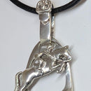 This large stirrup boasts a jumper horse making a huge effort with rider allowing with a giving hand. The horse is a sculpted raised relief in lovely form and you can see the rider in a jacket and boots with saddle, girth and bridle. The stirrup is 3D and has a strap with a buckle indicating the "leathers" as a bail. measures 1 3/8 inches tall x 7/8 inches wide. Bail has a 3 mm opening and arrives in a fine leather neck cord, 18 inches. Great gift for the jumping enthusiast!