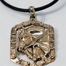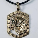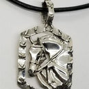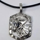 A special request has brought you this medium version of our new Jumper for 2021. The jumper horse has great physical detail, tucked front legs, a braided mane, bridle and breastplate. The frame surrounding the "cutout" horse appears as plaited reins with a bail. The pendant measures 1 inch wide x 1 1/2 inches tall overall with bail. Also available as a larger version, as one photo compares the 2 sizes. Arrives on a 18 inch leather neck cord. Sterling silver on a black leather neck cord, or Rose Bronze on chocolate brown leather neck cord, 18 inches. If you would like a 16 inch length, please leave a note in "Customer Notes" during check out, or choose it as an option below.