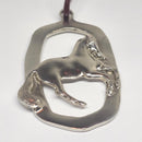 Another choice from our Holiday Ornament Collection, the Pirouette Horse. This sculpted Horse is captured in motion of the pirouette to the right with a [hidden] braided mane and swishing tail. There is no rider or tack, just the horse on this artistic oval shape. The piece measures 1 3/8 inches inches tall. There is a 10 inch leather cord which is attached to a set loop on the oval. The overall length is 6 inches. The leather cord has colors of red, green, blue or brown. You may request your preference but it will depend on availability. There is room for a bit of engraving: a year or short name--6 letters/ numbers are included with the purchase, Leave any info in " Customer Notes" during check out.