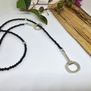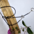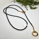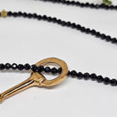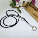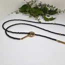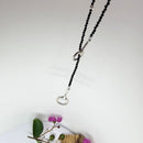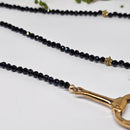Lariat type necklace with Snaffle Bits. Our Y necklace measure 26 inches in length and fits over the head. Next you can adjust the length by holding one of the snaffle piece and slide the other up or down to adjust the length. This necklace uses a sparkly black spinel bead with 5 golden bead stations spaced along the length. The beads are strung on a speacial bead wire [ twist ] with a vinyl coating, so it is incredibly strong. A striking piece on a T shirt or a more fancy outfit. Avalable in all Sterling Silver or our Rose Bronze with gf [ over sterling] findings. A favorite!!