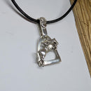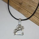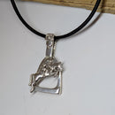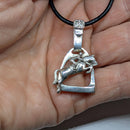 A dynamic design featuring the classic english stirrup with a full body profile of a jumping horse and rider, The stirrup hanges by the "leather" featuring buckle detail. The stirrup meaures 3/4 iches wide x 7/8 inches tall and with teh "leather " look bail, measures 1 3/8 inchea tall overall. The jumper is very dimensional with rider, saddlr and reins in view, knees tucked and jumping a high angle. High polish finish. Arrives on a 2mm black leather neck cord. You may also purchase with no neck cord at all. 16 inch, 18 inch lengths. The perfect gift for the hunter / jumper rider!! Also available in our yellow alloy.