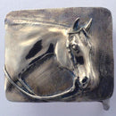 Western Pleasure Buckle. Measures 1 1/2 inch tall x 1 3/4 inch wide. Same detail as large Pendant. Quarter Horse with Western Bridle, SweetWater Bit, and draping Reins. Fits 1 1/4 inch leather belt. Check out our Leather Page for belt options.