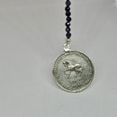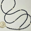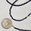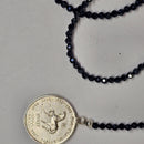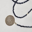 Lariat Necklace made of 3 millmeter black spinel beads, 15 inches in length, with sterling bead stations every 4 inches. One end has a toggle hoop and the other is a fine sterling coin [ cast in sterling] Of the year of the Horse Coin. Every 12 years the Chinese zodiac repeats the year of the horse, noted on this coin from 1906 to 2002. The coin is from Somalia, and measures 1 inch round. Available in all Sterling Silver, our favored Rose Bronze with gf / sterling bead stations and findings OR our Golde Alloy. A personal favorite!!