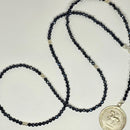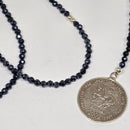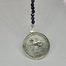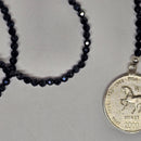 Our new Year of the Horse Coin, double sided, on a lariat spinel bead necklace. This lovely coin features 100 years of the dates of this celebrated "Year of the Horse" from 1906 to 2002. This coin is a replica from Somalia, measuring 1 inch round and it can be slid up or down to tighten or loosen this lariat fit. The sparkly off black spinel beads have a smokey tint with sterling bead stations every 4 inches. The overall length of the lariat is approx 25 inches and fits easily over your head. No clasp required! Looks great with a T shirt or that simple dress needing a special something. Coin is cast in sterling silver and all findings on this lariat are sterling.